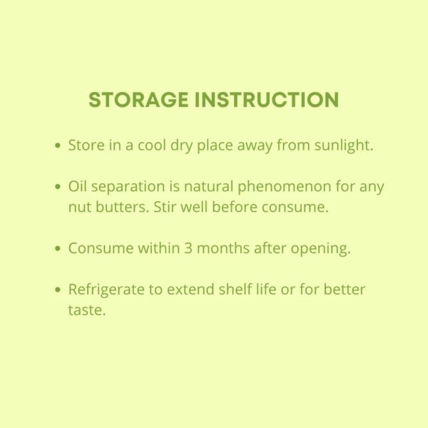 • Oil seperation is natural phenomenon for any nut butters. Stir well before cosume.